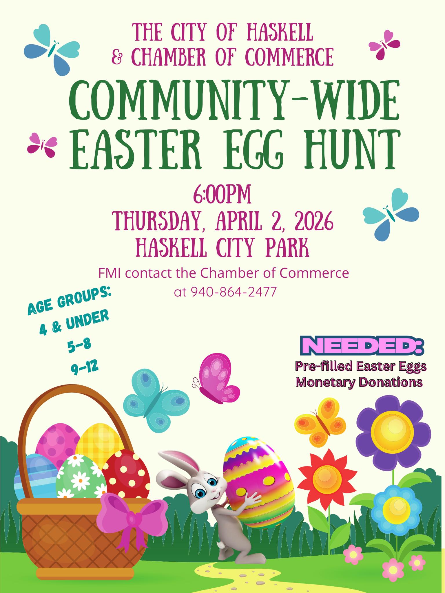 Community-Wide Easter Egg Hunt The City of Haskell and the Haskell Chamber of Commerce invite you to join us for ... Read More >